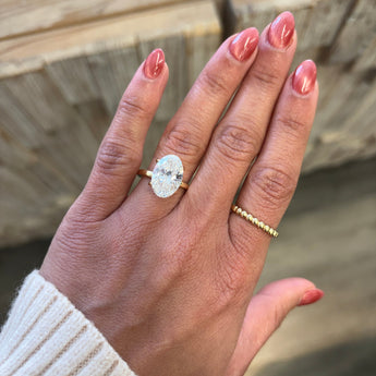 This beautiful engagement ring is the one and only classic Oval lab grown diamond 14K gold solitaire engagement ring. Brides love this solitaire engagement ring because you can mix and match any women's wedding wedding bands for the perfect stack.