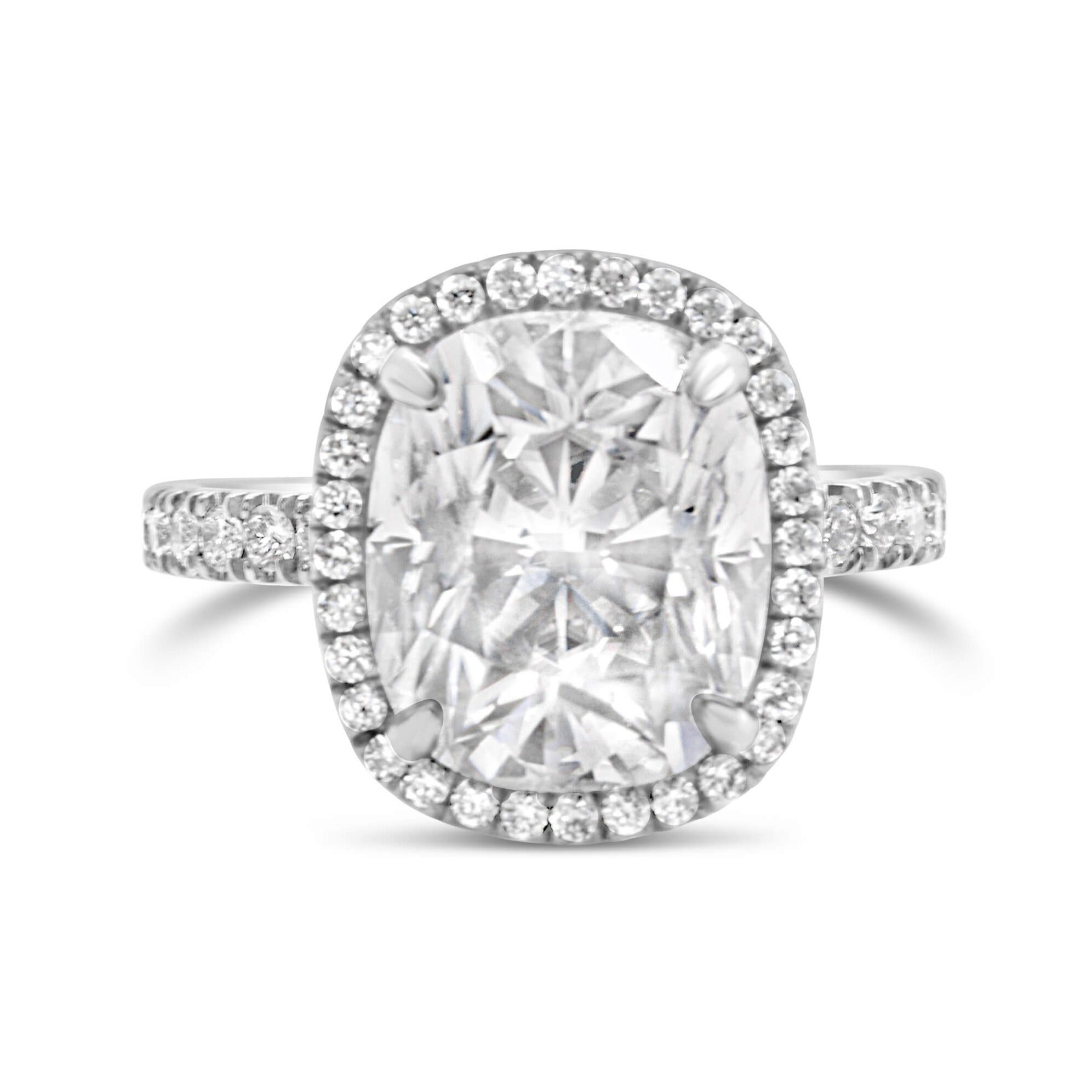 This beautiful setting is the one and only classic elongated cushion engagement ring that features a halo around the center stone and a hidden halo with accent diamonds on the shank.