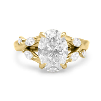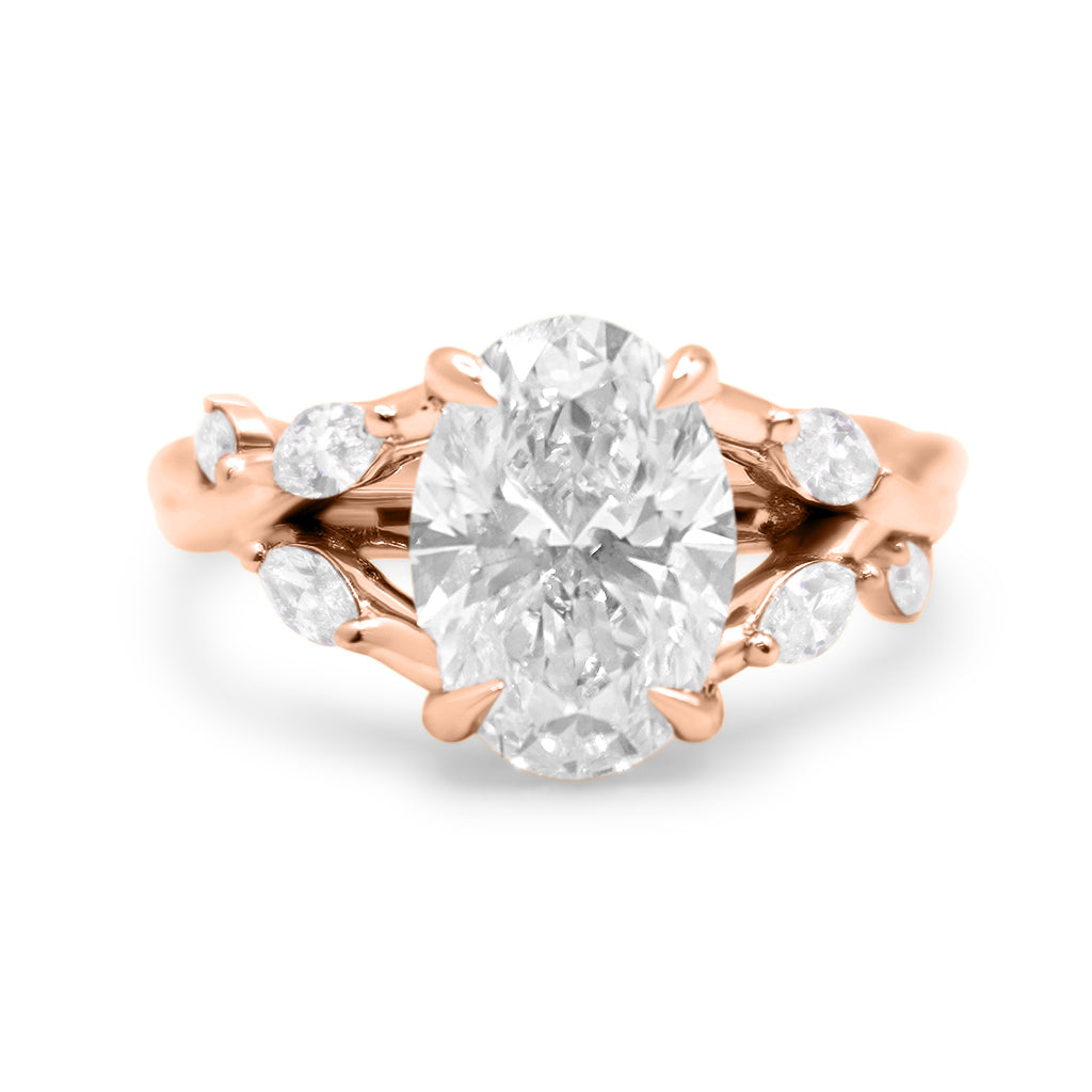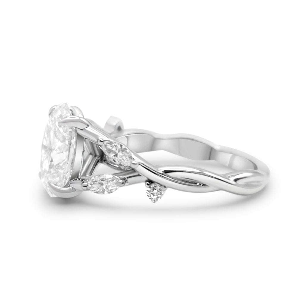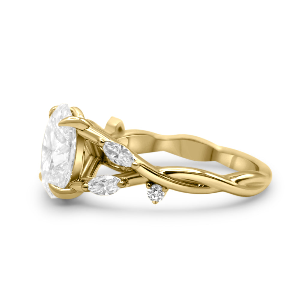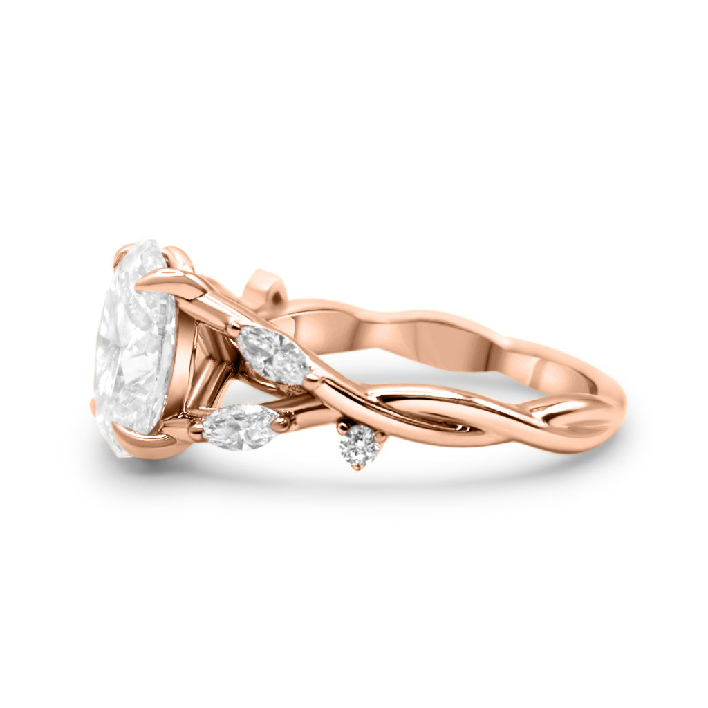 This ring is perfect for any center stone, it has a twisted band with marquise accent lab grown diamonds that create a delicate nature-inspired look. The design is completed with an elegant cathedral setting.